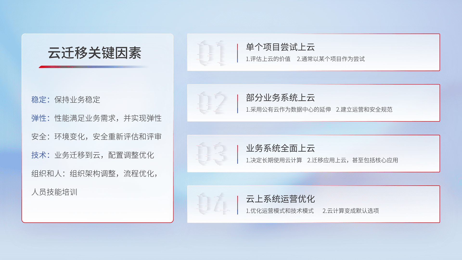 结合实际业务,,,从规划设计、、云平台选型、、、、云原生改造、、、数据迁移、、集成交付,,迁移全过程为客户识别最佳上云路径,,,,做好风险识别管理,,,设计网络架构、、身份权限、、、安全审计合规、、、、操作审计、、日志审计、、监控告警策略、、多站点容灾设计等,,,,对云上基础设施进行整体规划,,提升IT治理水平,,,以满足弹性、、、、高可用、、、高性能的需求。。