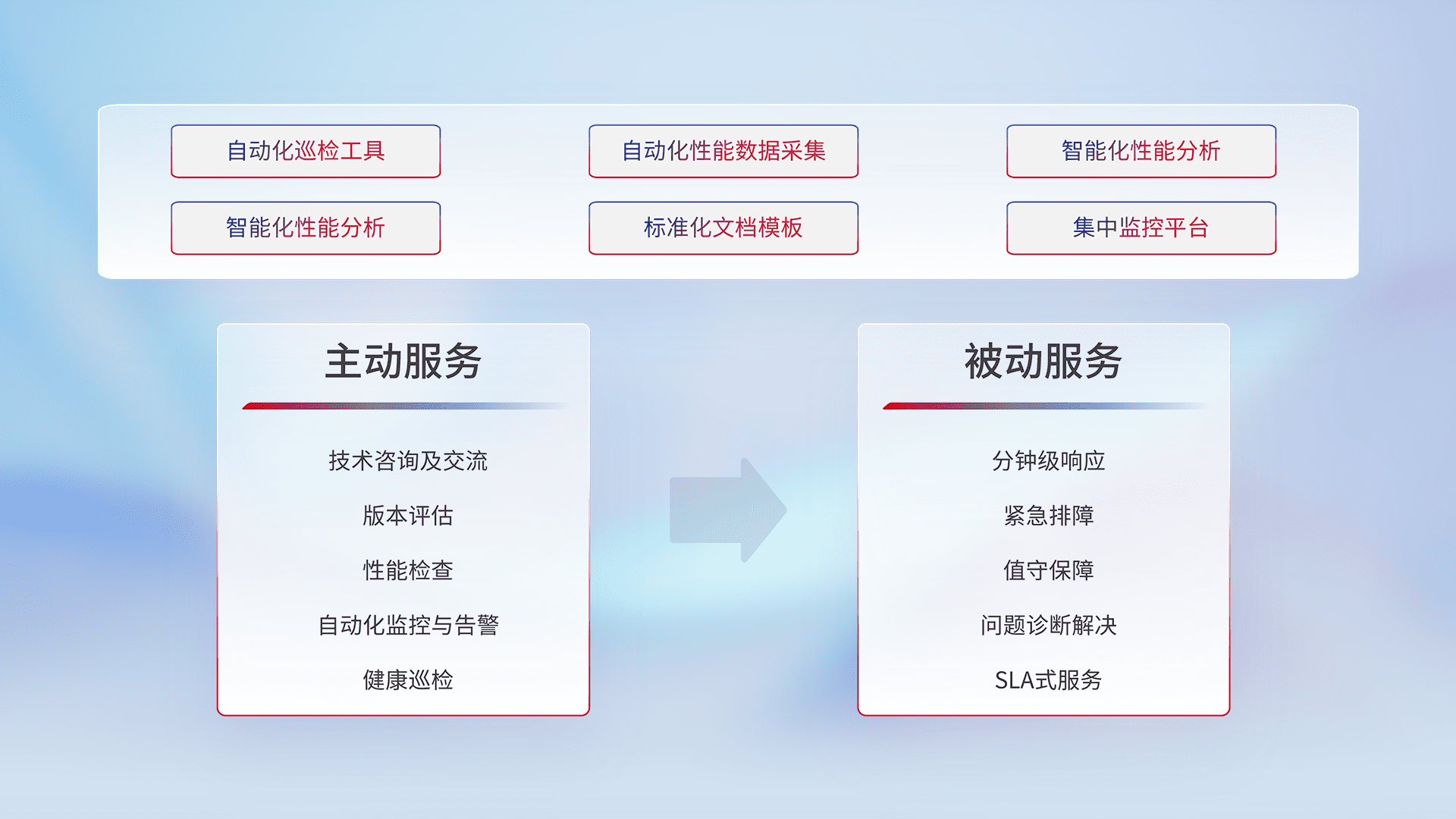 智能化工具和标准化文档,,,保障服务质量,,,提供主动服务(包含技术咨询、、版本评估、、性能检查、、自动化监控与告警、、健康巡检)和被动服务包含(分钟级响应、、、、紧急排障、、、、值守保障、、、问题诊断解决、、、、SLA服务)。。