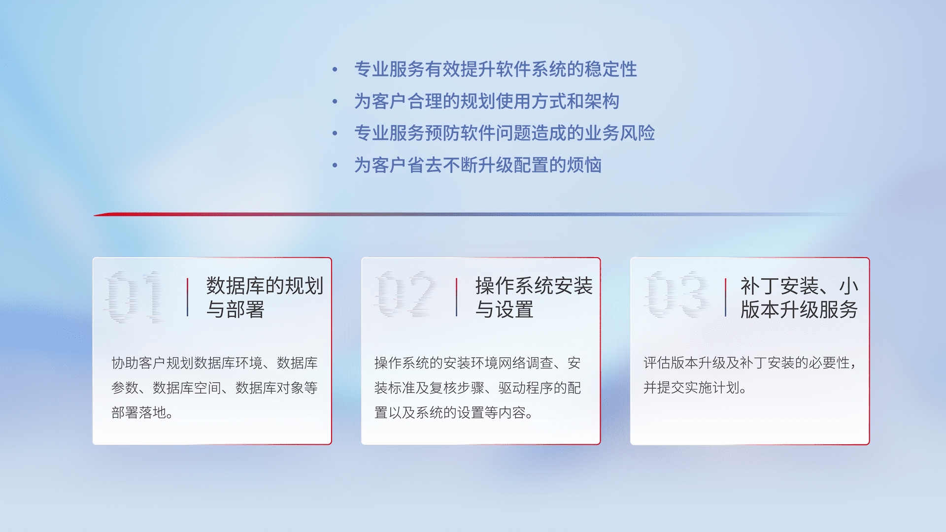 为客户提供软件规模升级、、快速部署、、、、按需配置的专业服务,,从数据库的规划与部署到操作系统的安装与设置,,,再到补丁安装和小版本升级提供支持。。。